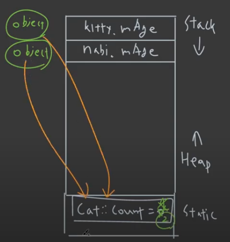 근데, static member variable은 static영역이라고 따로 있는 곳에 할당이 되서 object들이 같은 메모리 공간을 공유하게 된다.